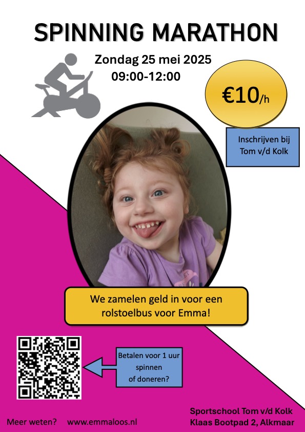 Op zondag 25 mei 2025 organiseren we een energieke spinningmarathon bij Sportinstituut Tom van der Kolk in Alkmaar. Van 09:00 tot 12:00 krijg je de kans om drie uur lang te trappen voor een goed doel.